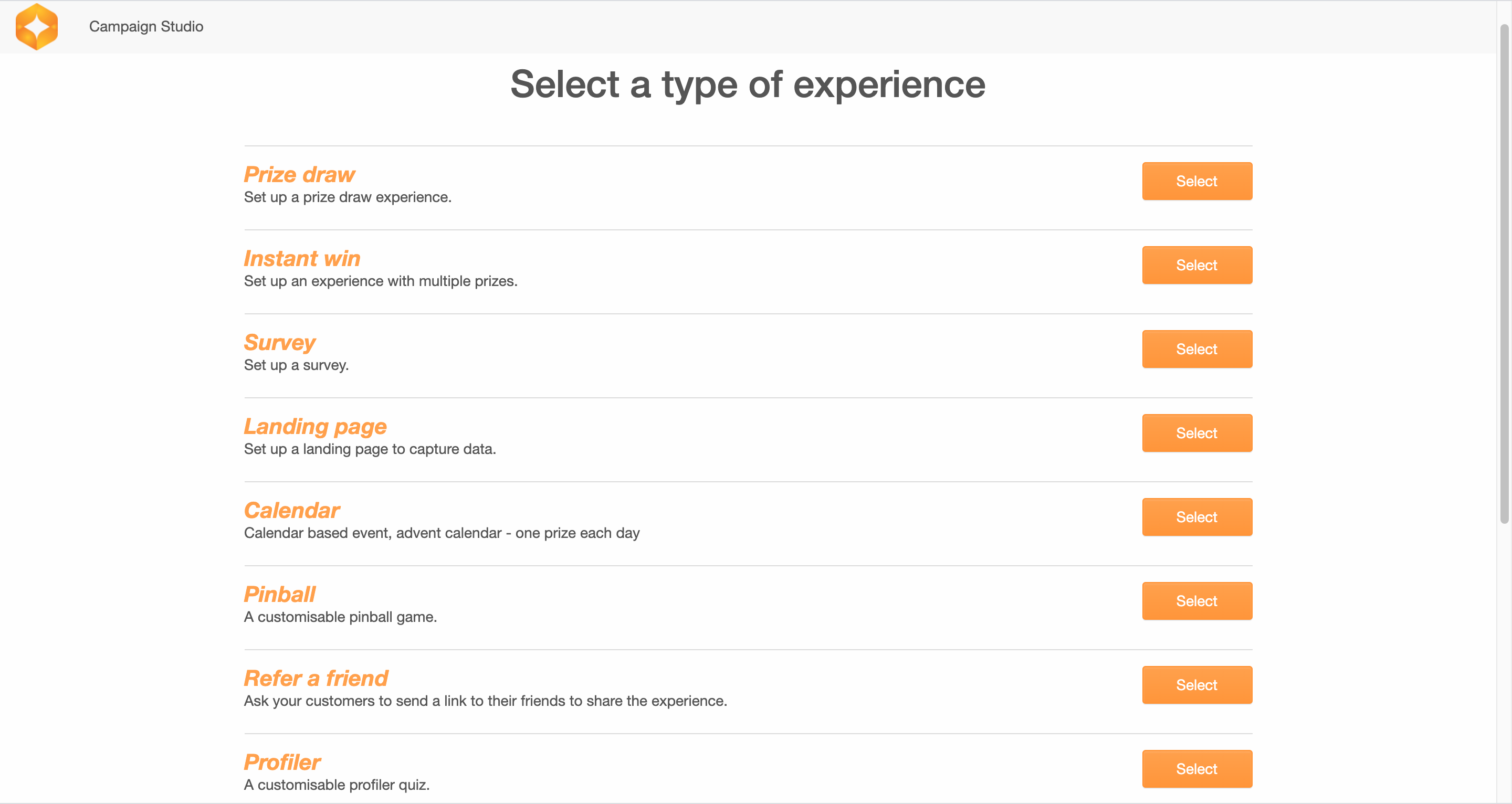 If you chose to create a new experience and not use a template, you will be redirected to a page where you can pick your Experience type, choose calendar. Your experience is now created and will need to be populated with assets.