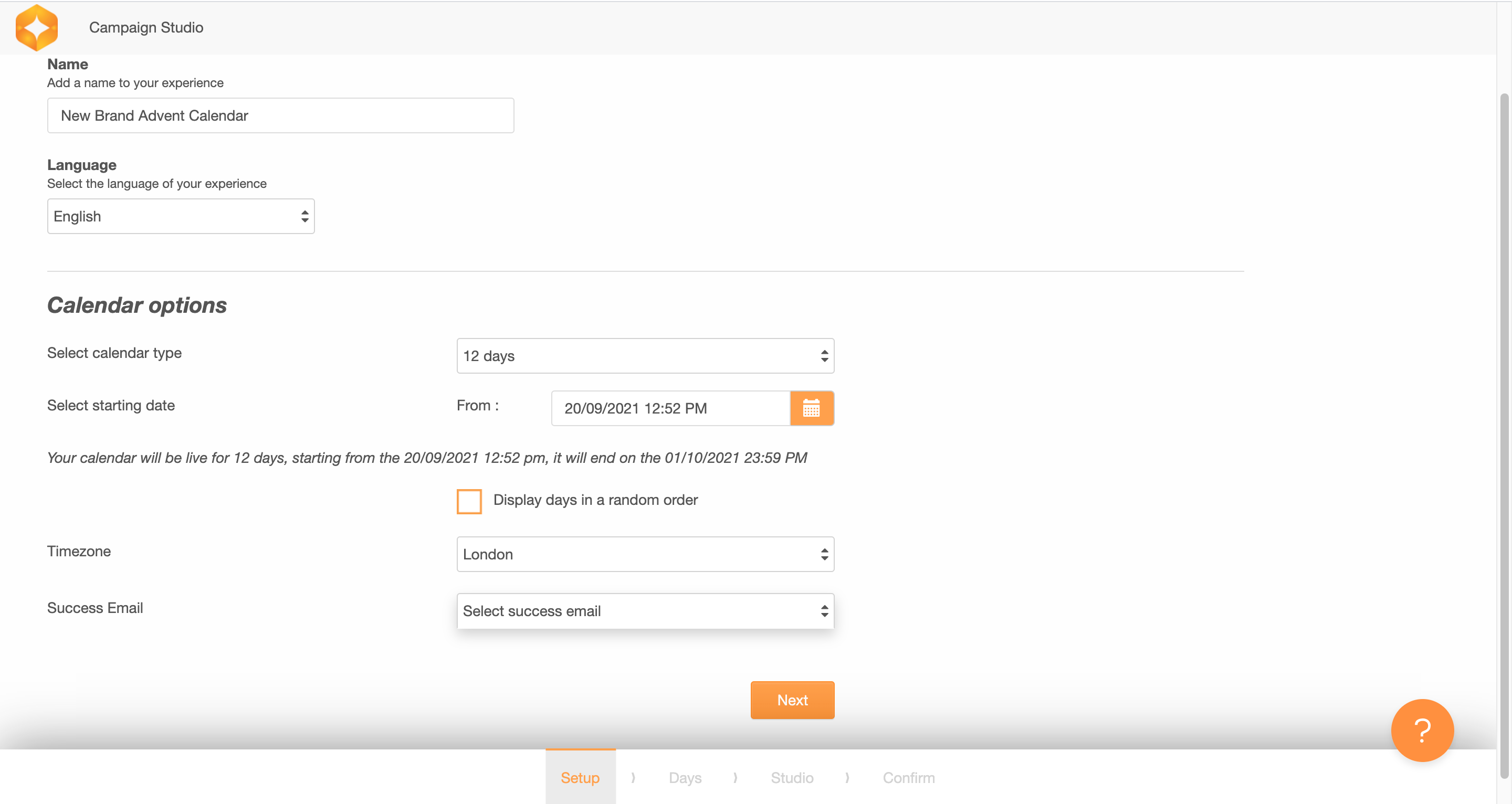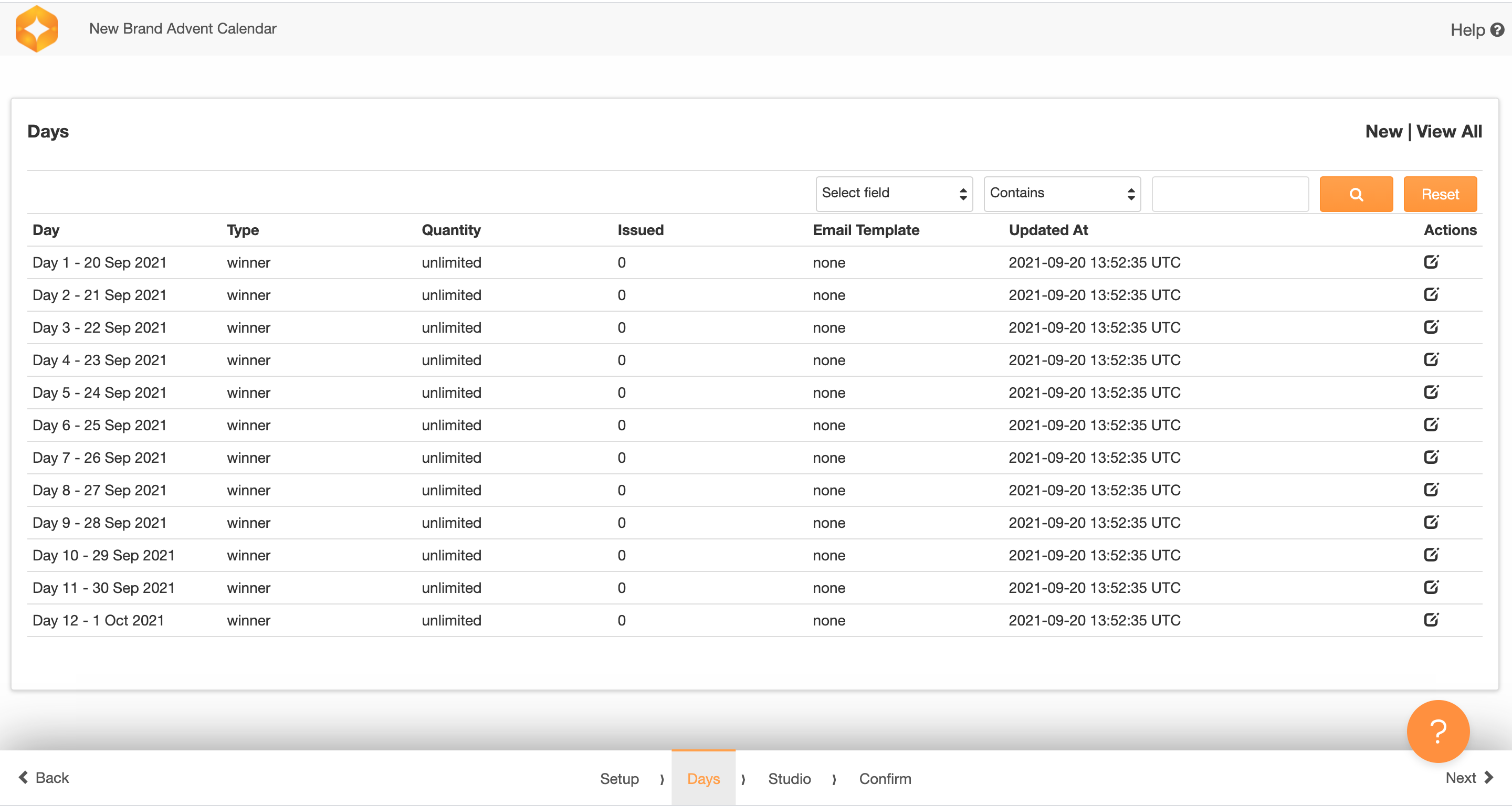 Once you have finished your Setup, is now time to organise your prizes for each day of your advent calendar. In the menu 'Days' you will have available 12, 24 or a custom number of prizes.