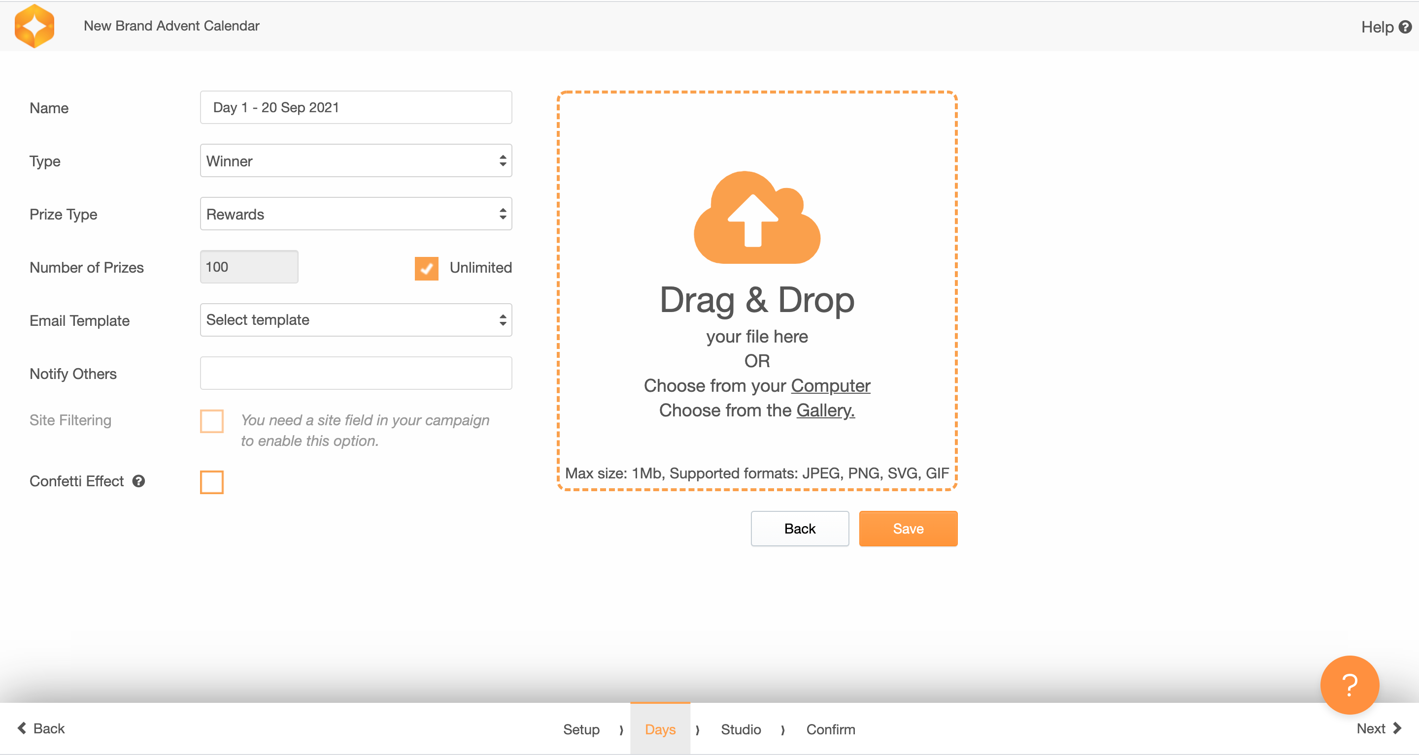 You can choose to offer two prize types, vouchers or rewards. If you are offering rewards for the winners, you will have to enter the 'Number of Prizes' you have available for the day you are configuring. If you have an unlimited number of rewards (example: unlimited % discounts) tick the button 'Unlimited'.