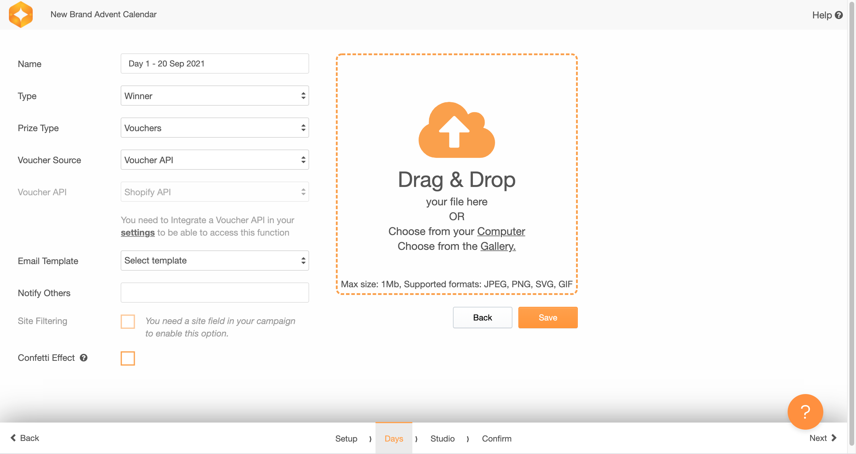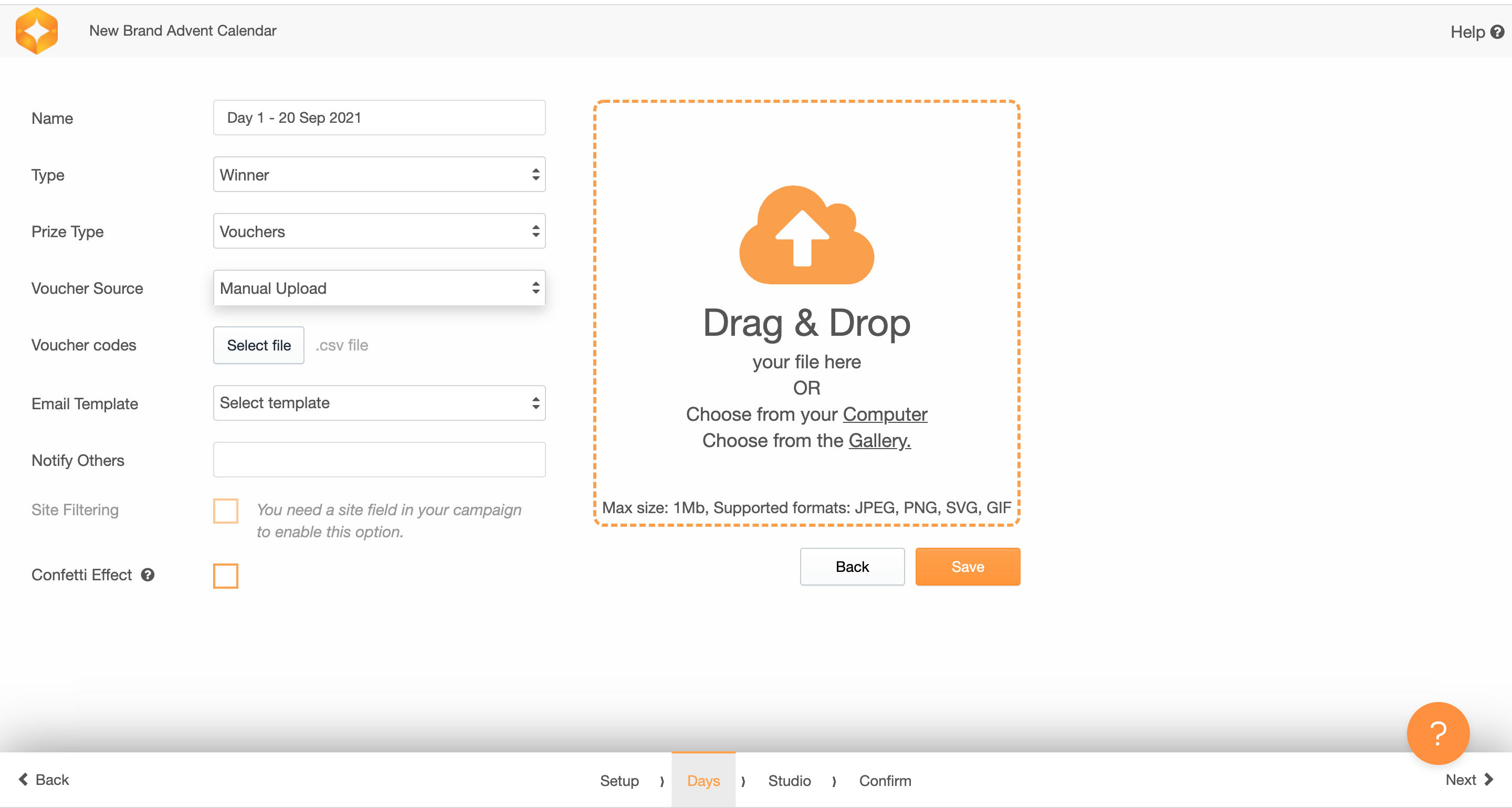 If you are offering vouchers for the winners, you will have to choose between manually uploading your vouchers or a voucher API. When manually uploading vouchers, a '.csv' file will be required.