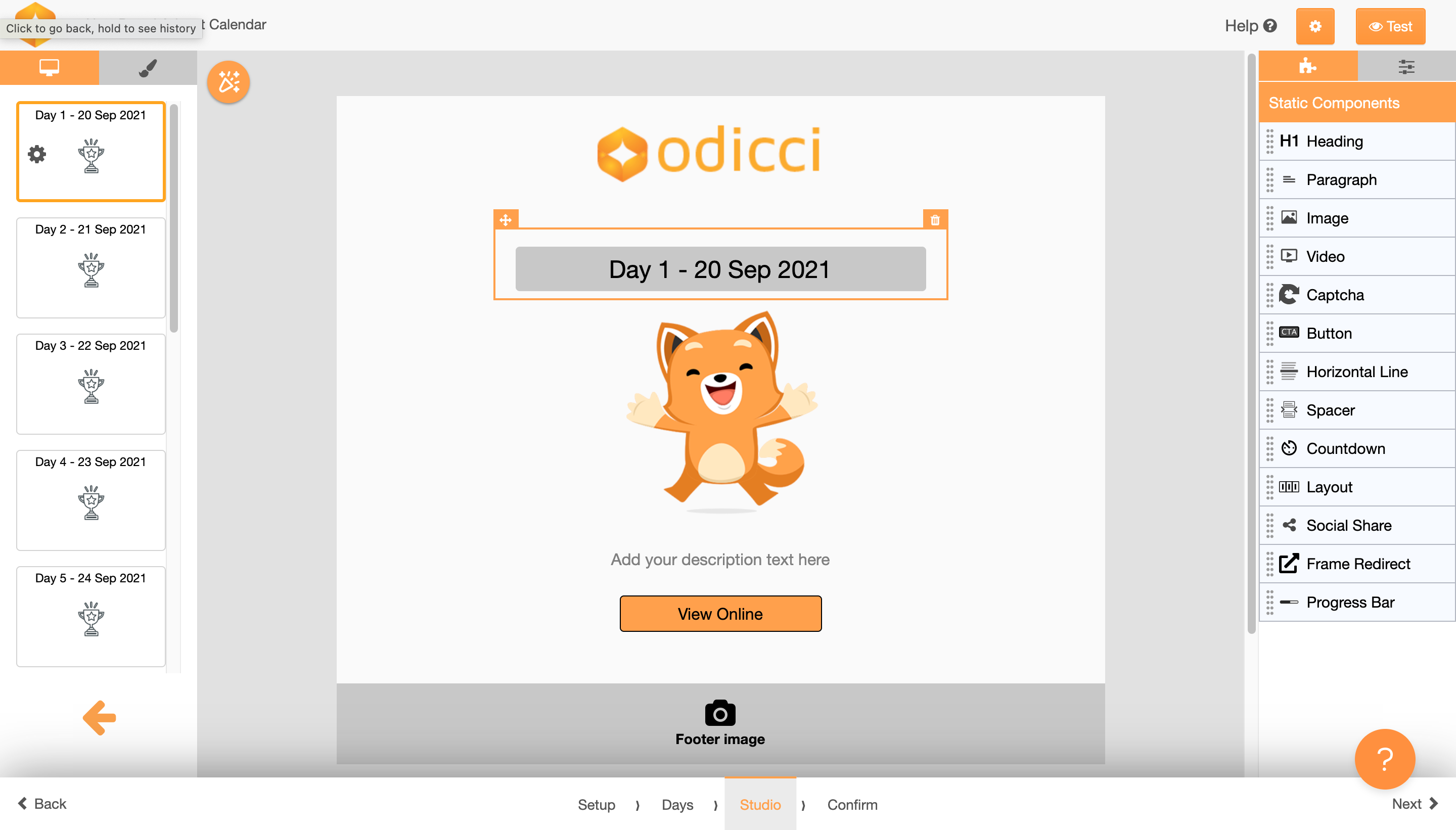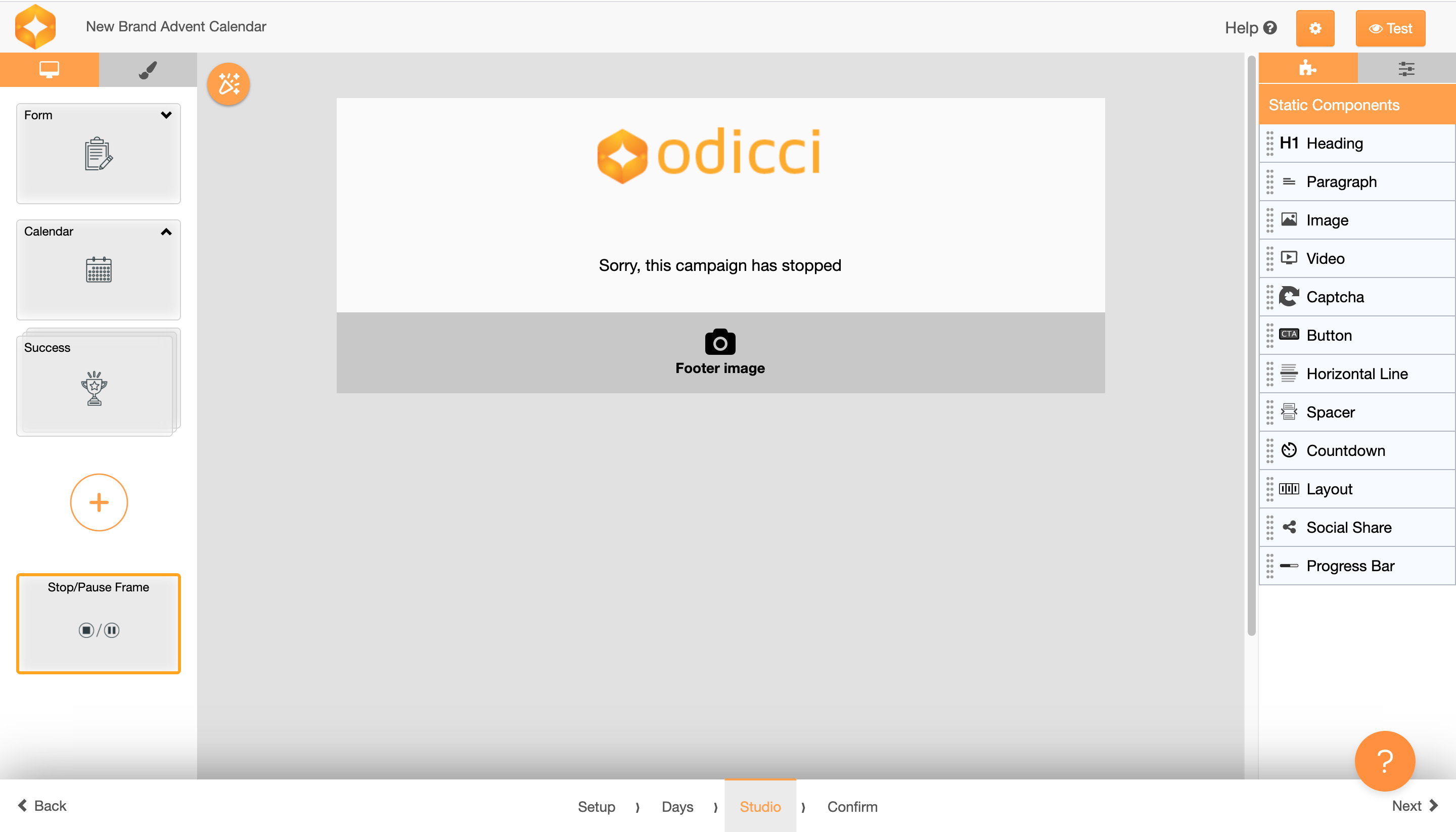 There will be a success frame available for each day of your experience (example: 12 frames, 24, custom). Use Static Components to build each success frame.