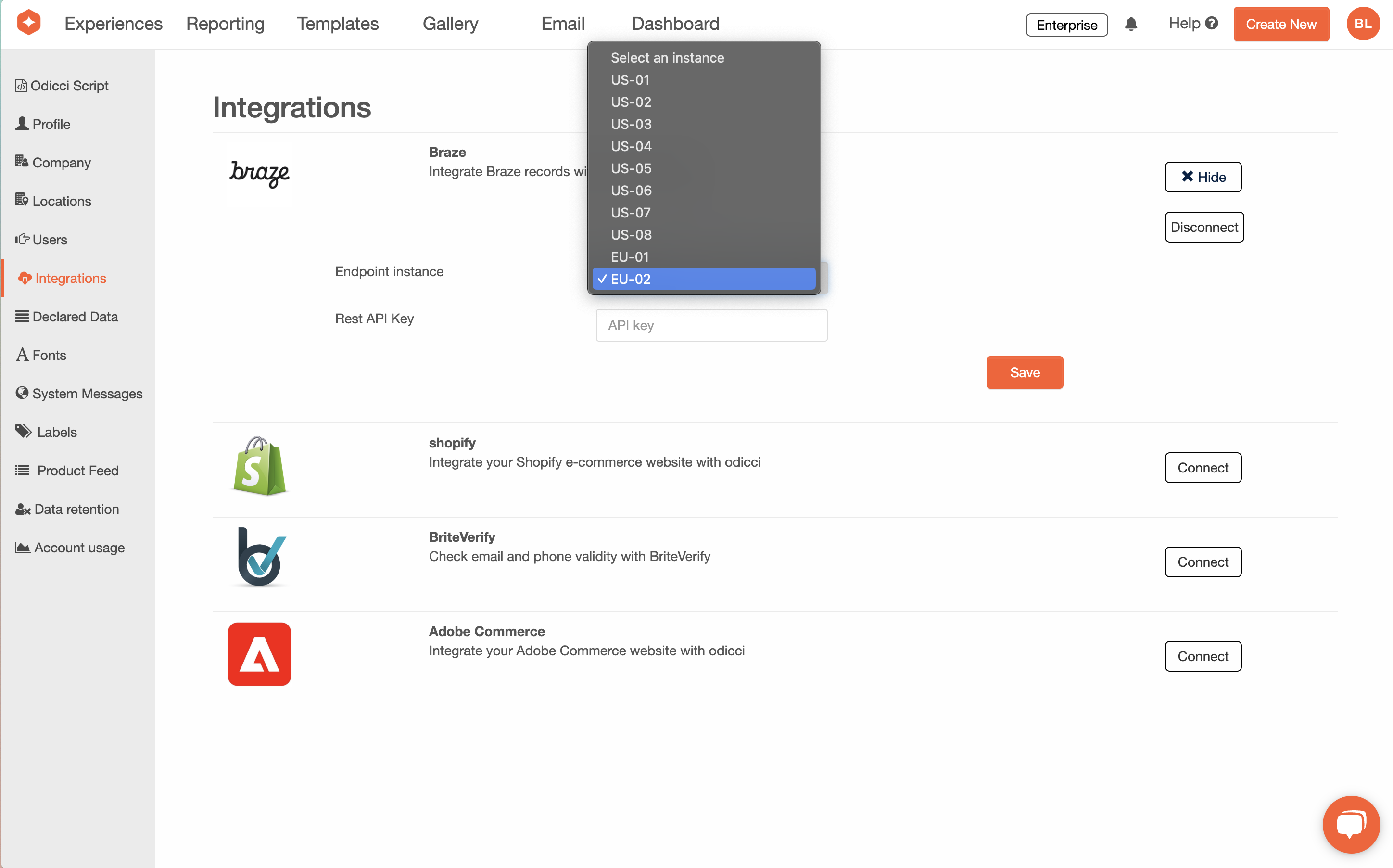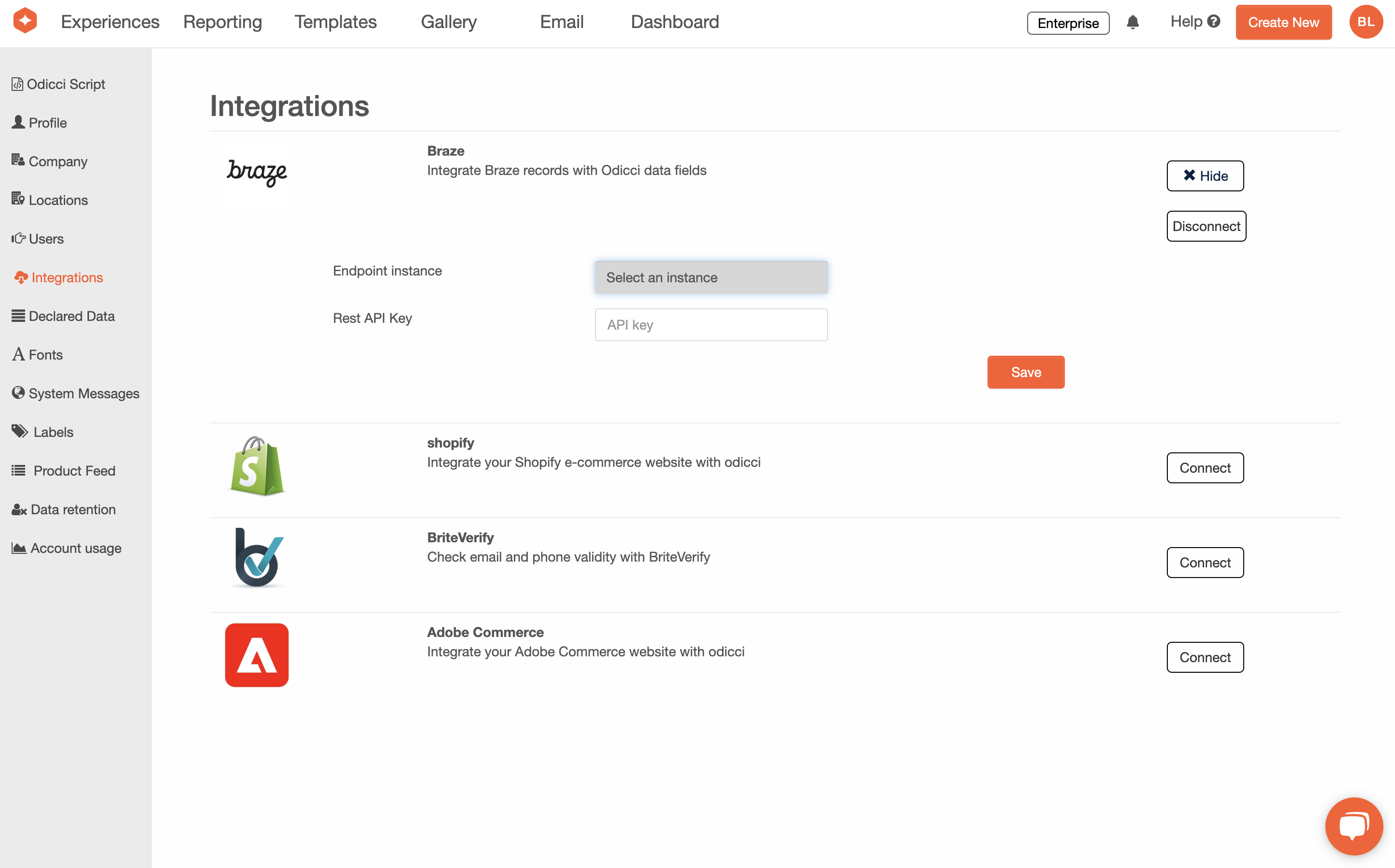 - Enter Braze Credentials: Have your Braze REST API Key and Endpoint Instance ready. Input them into the corresponding fields in Odicci: