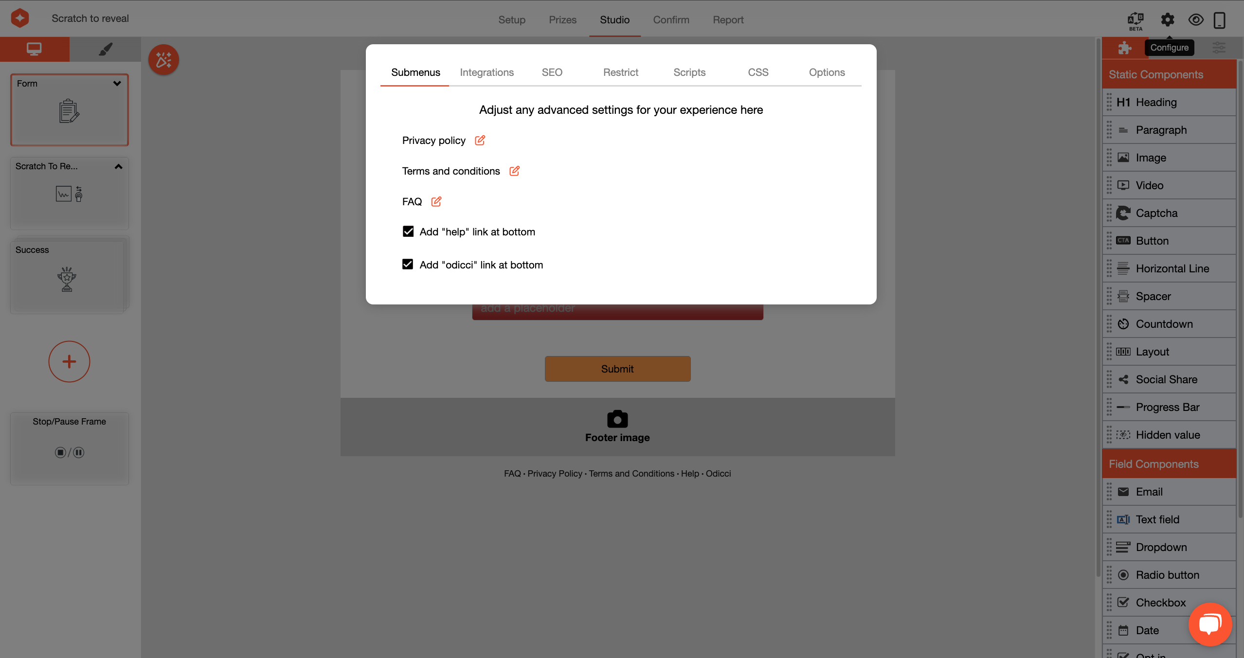 In the Scripts menu you can input any custom scripts you require to be run on the experience page such as Google Analytics tracking.