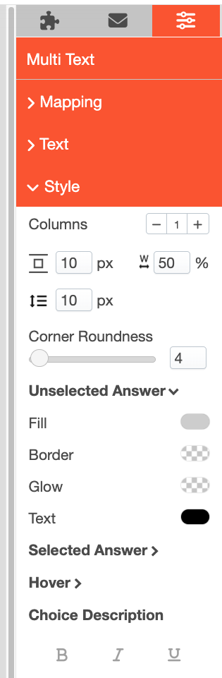 Alongside the standard text formatting available on all frames, multi-text and multi-image frames also allow you to edit the formatting of the answer options when unselected, selected or hovered over.