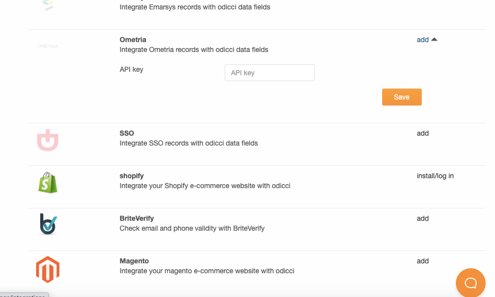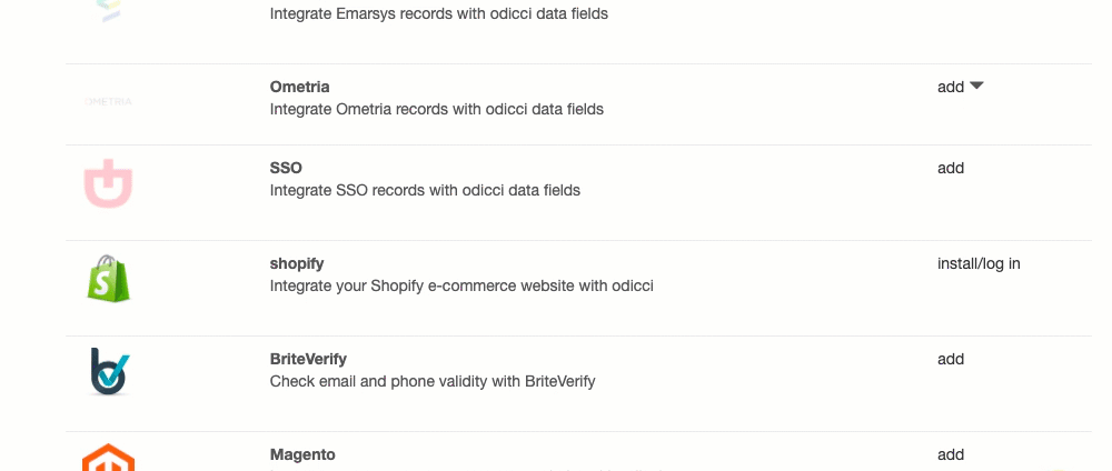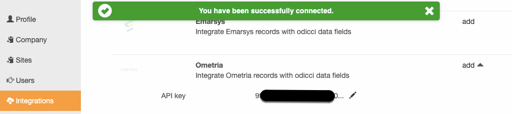 In your Odicci account click on the icon in the top right corner and select settings. Within settings navigate to Integrations, scroll to Ometria and click on ADD.
