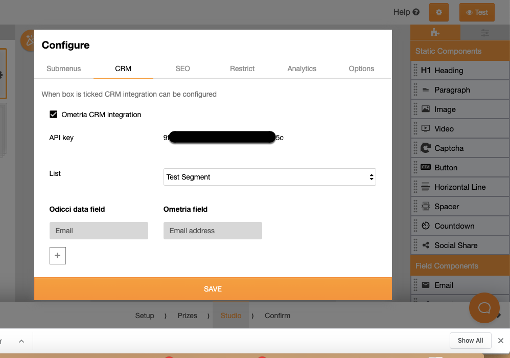 In your Odicci experience click on settings (cog wheel inside studio) to access the CRM integration. Click on Ometria CRM integration to activate, select the Ometria list where the data should be fired.