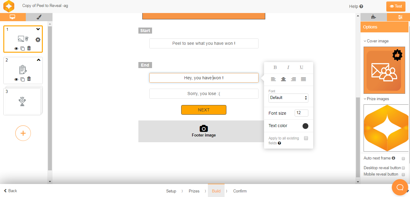 End - Enter the winner and loser text which should be displayed after peeling the image.