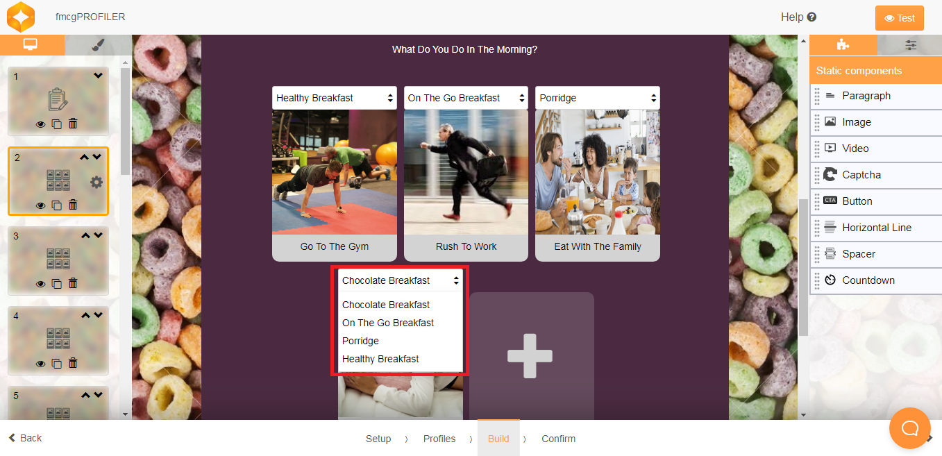 Within the microsite builder under > BUILD you can then directly add the form field To add the Multi text and Multi Image frames used for survey. Profiler can be used in Multi text and Multi image as above. Based on the inputs provided by the user, a profile is picked for the user.