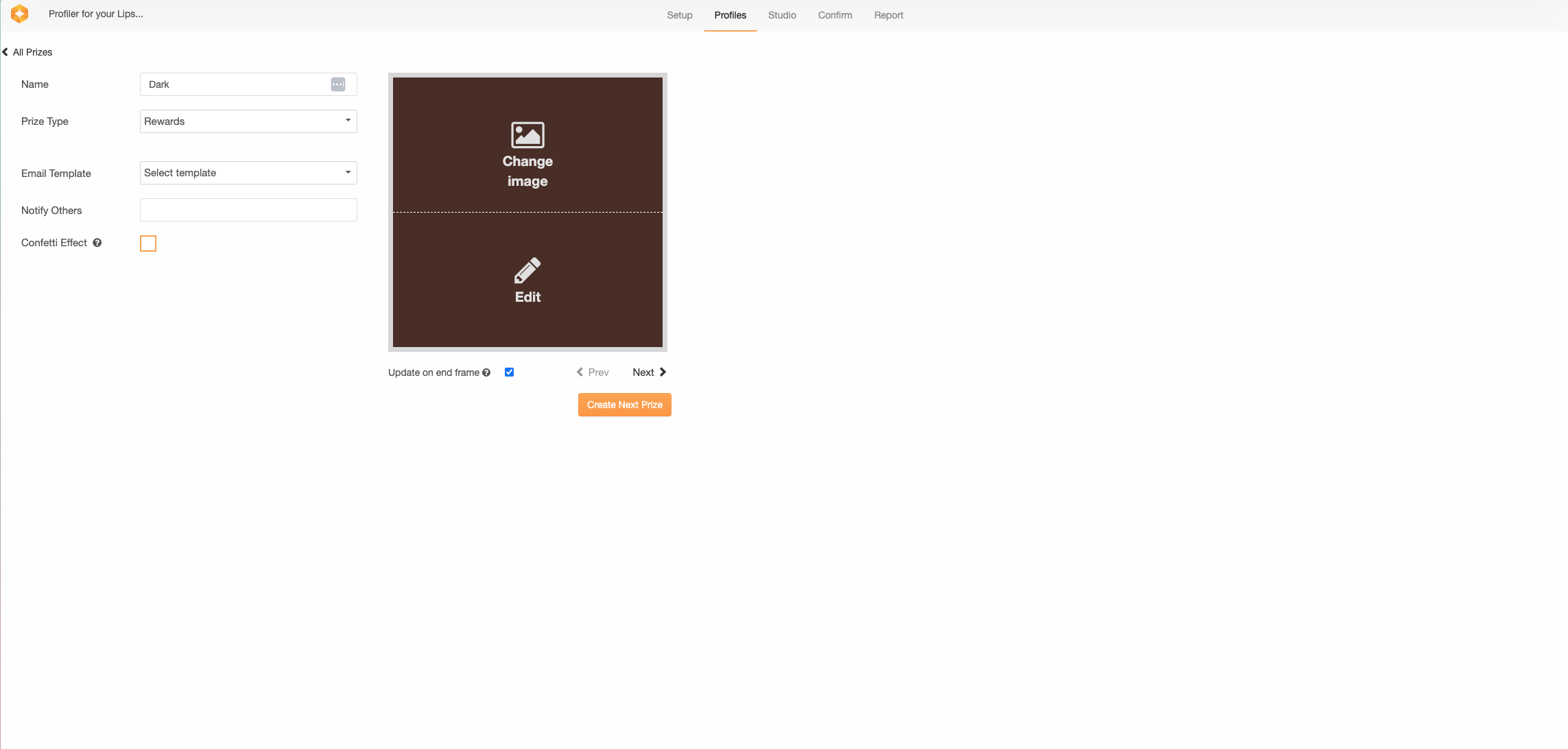 You must add a name, prize type and any email template that you have set up to the prize. To change or add a new image, simply click the add image button to upload your content.