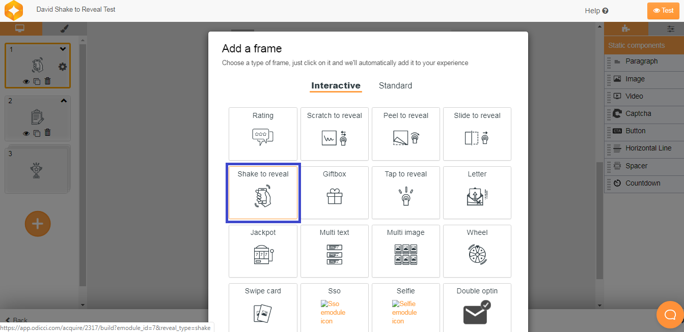 Within the microsite builder under > BUILD you can then directly add the form field To add the Shake to reveal, click Add a new frame and select the Shake to reveal.