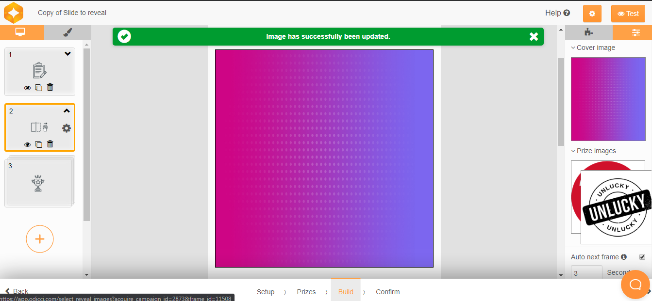 Prizes - Prizes can be configured in the Prizes page, you can add as many prizes required for the experience and can assign the notification email and image for each prize, these images will be used in the slide to reveal.
