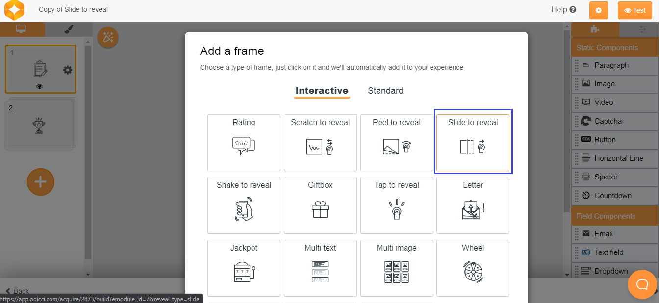 Within the microsite builder under > BUILD you can then directly add the form field To add the Slide to reveal, click Add a new frame and select the Slide to reveal.