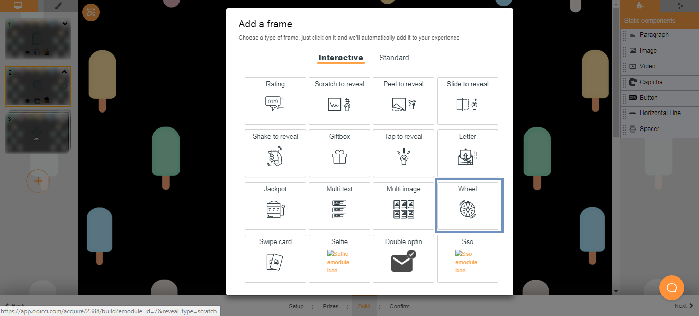 Within the microsite builder under > BUILD you can then directly add the form field To add the wheel click Add a new frame and select the Wheel.
